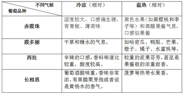 每個品種的葡萄的果粒大小、果皮厚度、色澤、色素量和密度,所含單寧的量及質量,風味成分的構成,熟成難易度,土壤和氣候的適應性等,這些因素的不同,將造成所釀葡萄酒的香味、酸味和澀味以及口感、酸度和色澤等發生變化。